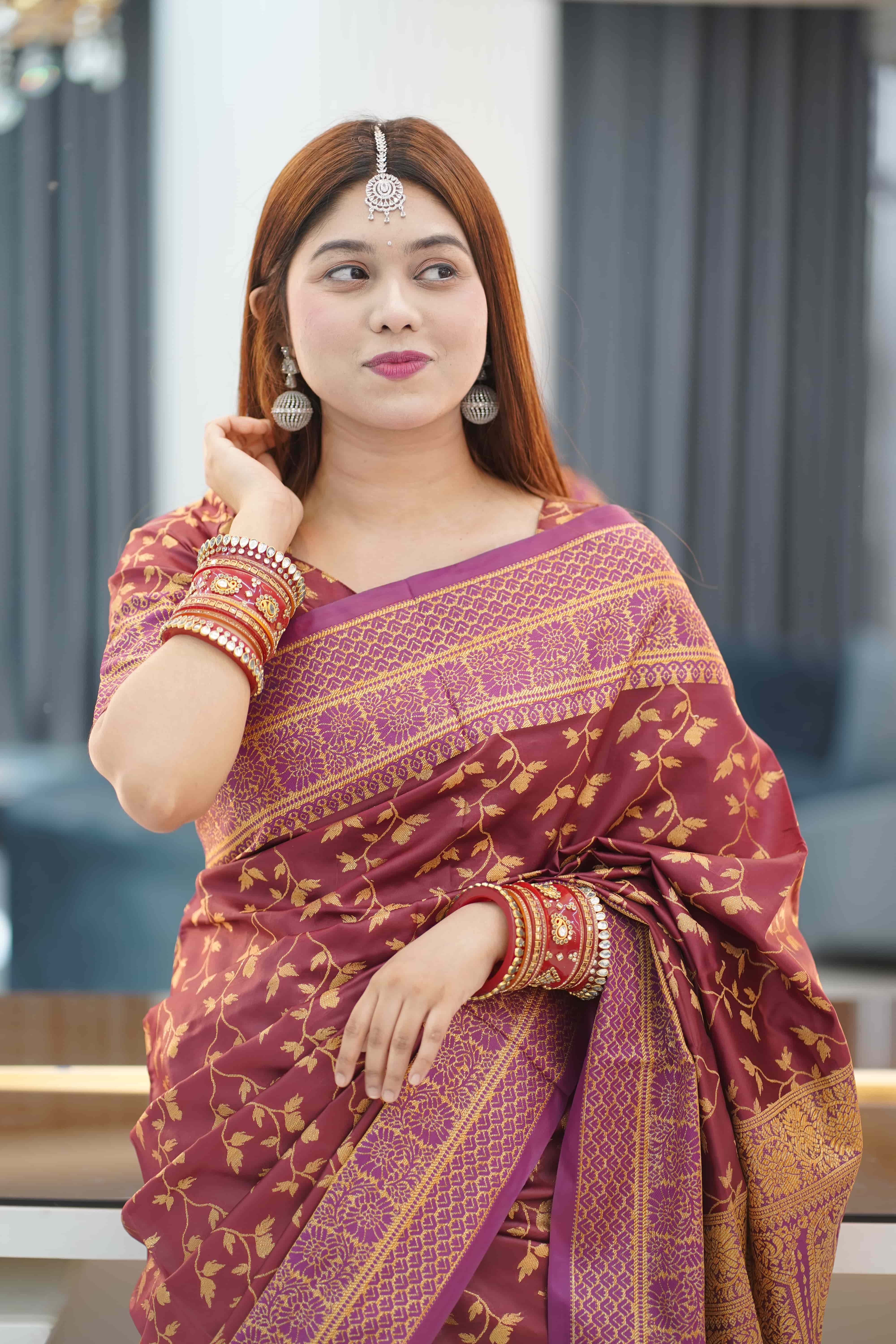 This beautiful premium Katan silk saree is designed with traditional Minakari thread work, giving you a royal and elegant look while staying comfortable all day.
