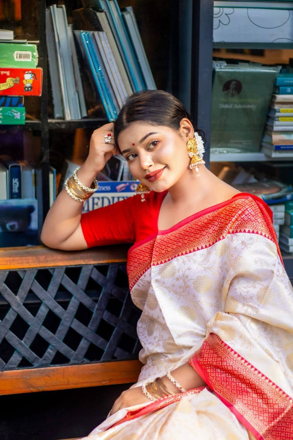 ঐতিহ্যের লাল-সাদা ব্লাউজ পিস সহ
